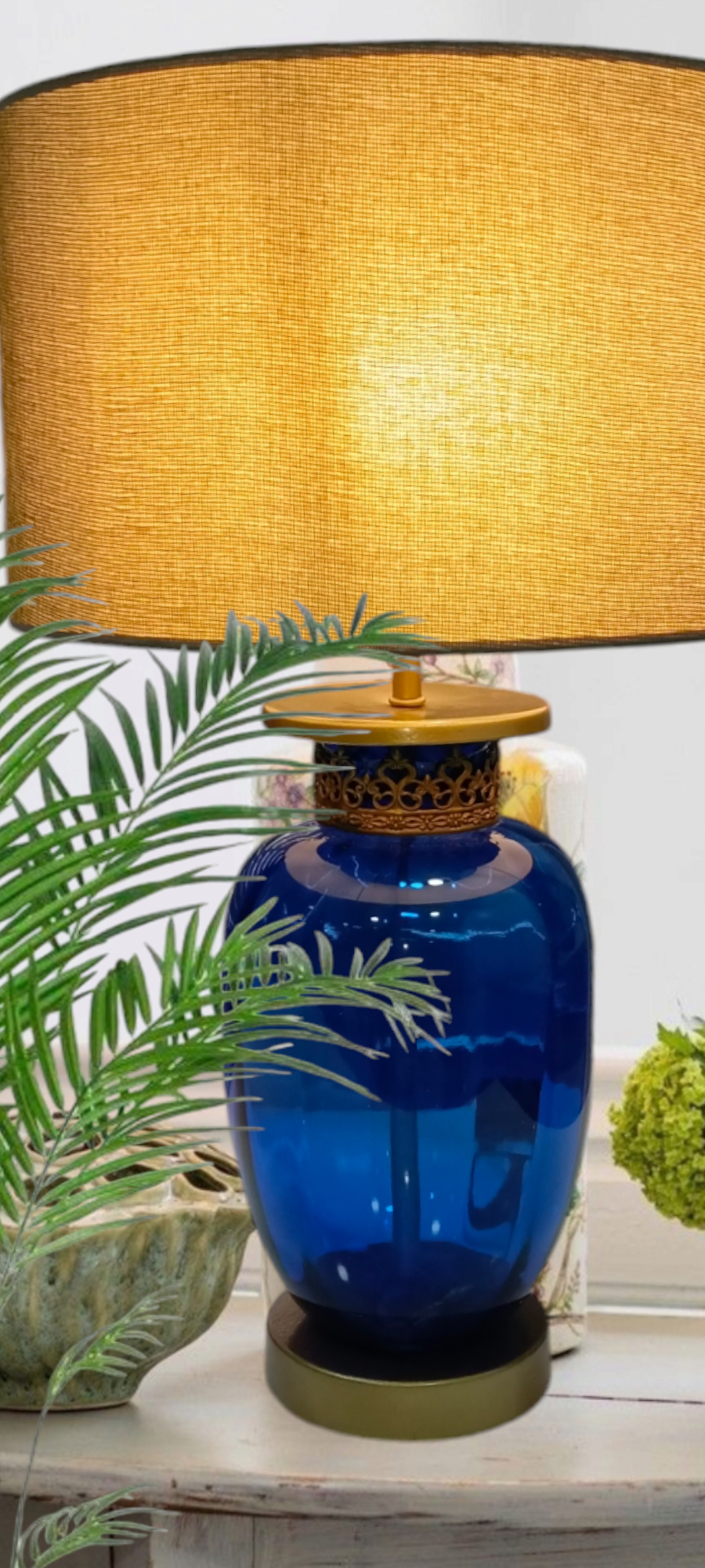 Şeffaf Saks Rengi İltalyan Cam  Gövdesi Gold Metalli Aynı Metalden  kaide Ve Keten Jüt Özel Şapkası Ölçüler/Gövde Çap:55cm.Boy:41cm.Kumaş Şapka Çap:36cm. Boy:22cm.